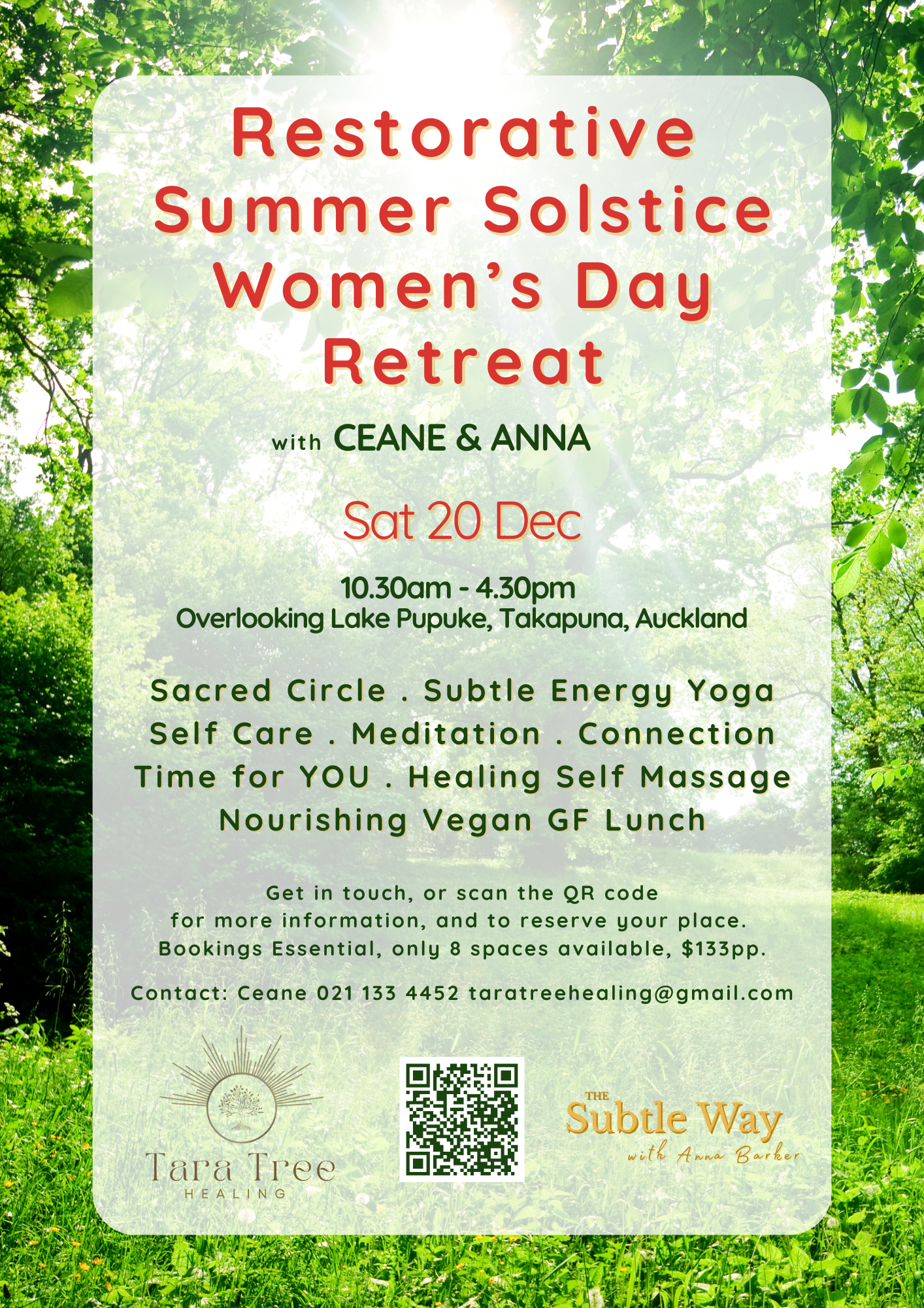 This Summer Solstice retreat offered a restorative day for women to pause, release the weight of the year, and restore their energy. Through Subtle Energy Yoga, gentle self-massage, and healing activations, participants soothed their nervous systems and reconnected with their inner balance. In a Sacred Circle, we reflected, journaled, and meditated to honor the closing cycle and embrace renewal. A nourishing, gluten-free vegan lunch, Cacao mindful ceremony and light refreshments supported the day, creating a loving reset that left attendees feeling grounded and revitalized.